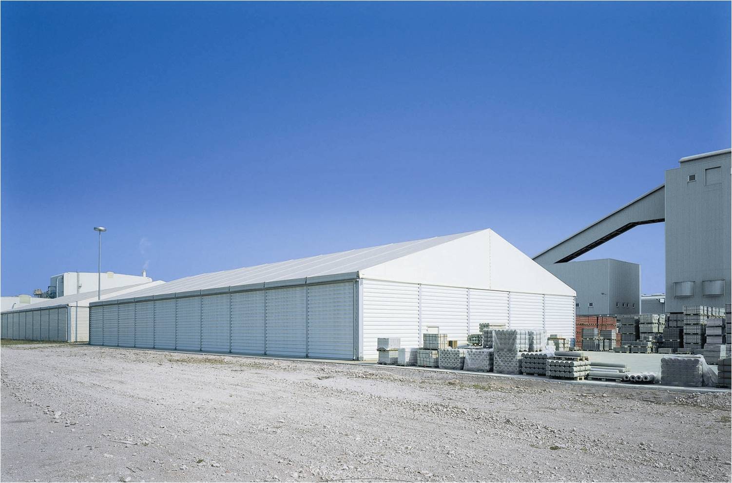 營造一個這樣的空間,在操作實行上的選擇有很多。目前,鋁合金倉儲帳篷憑借其防塵效果好、結構安全、施工簡單快捷、造價低廉、跨度大等優點,正逐步取代傳統建筑,為企業解決煤灰儲存環保問題。